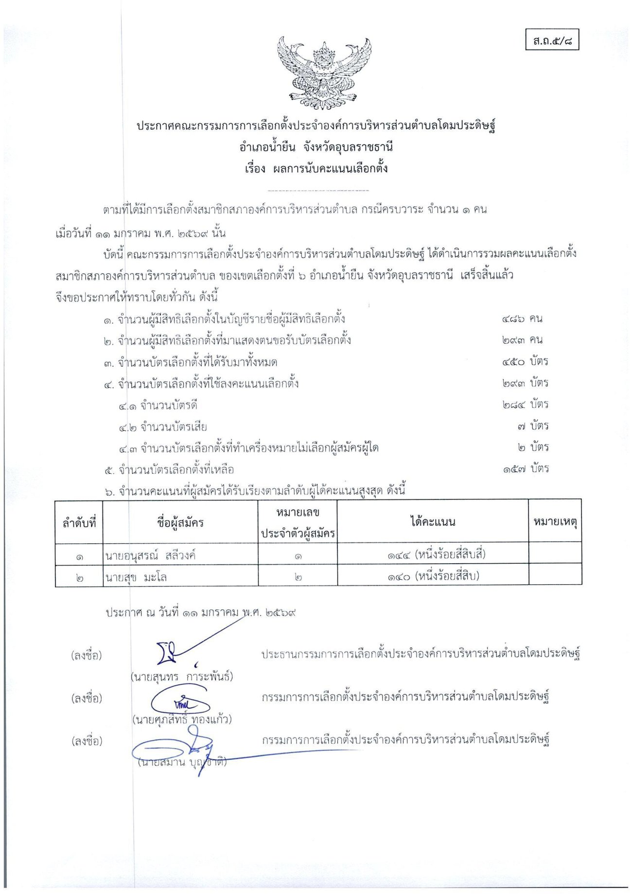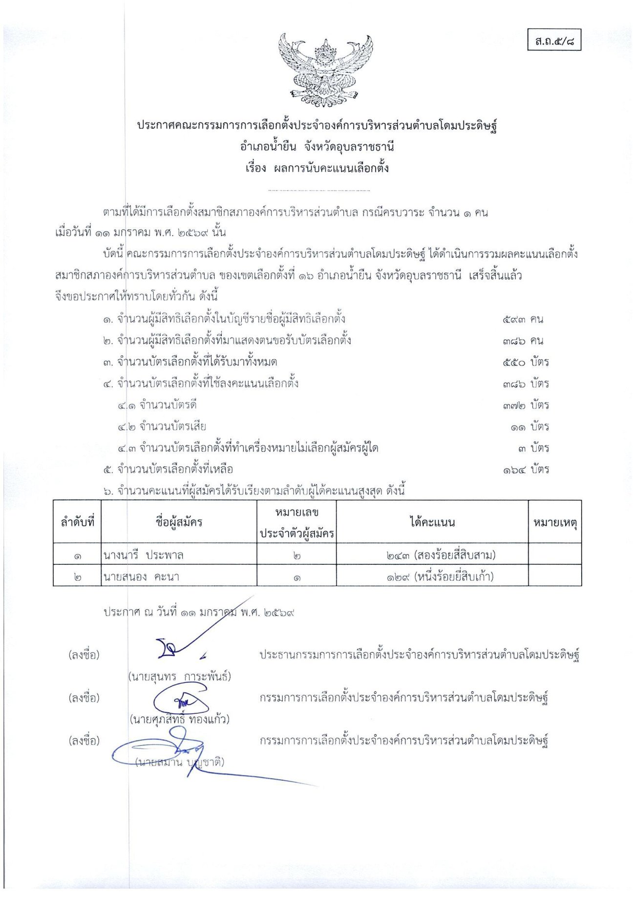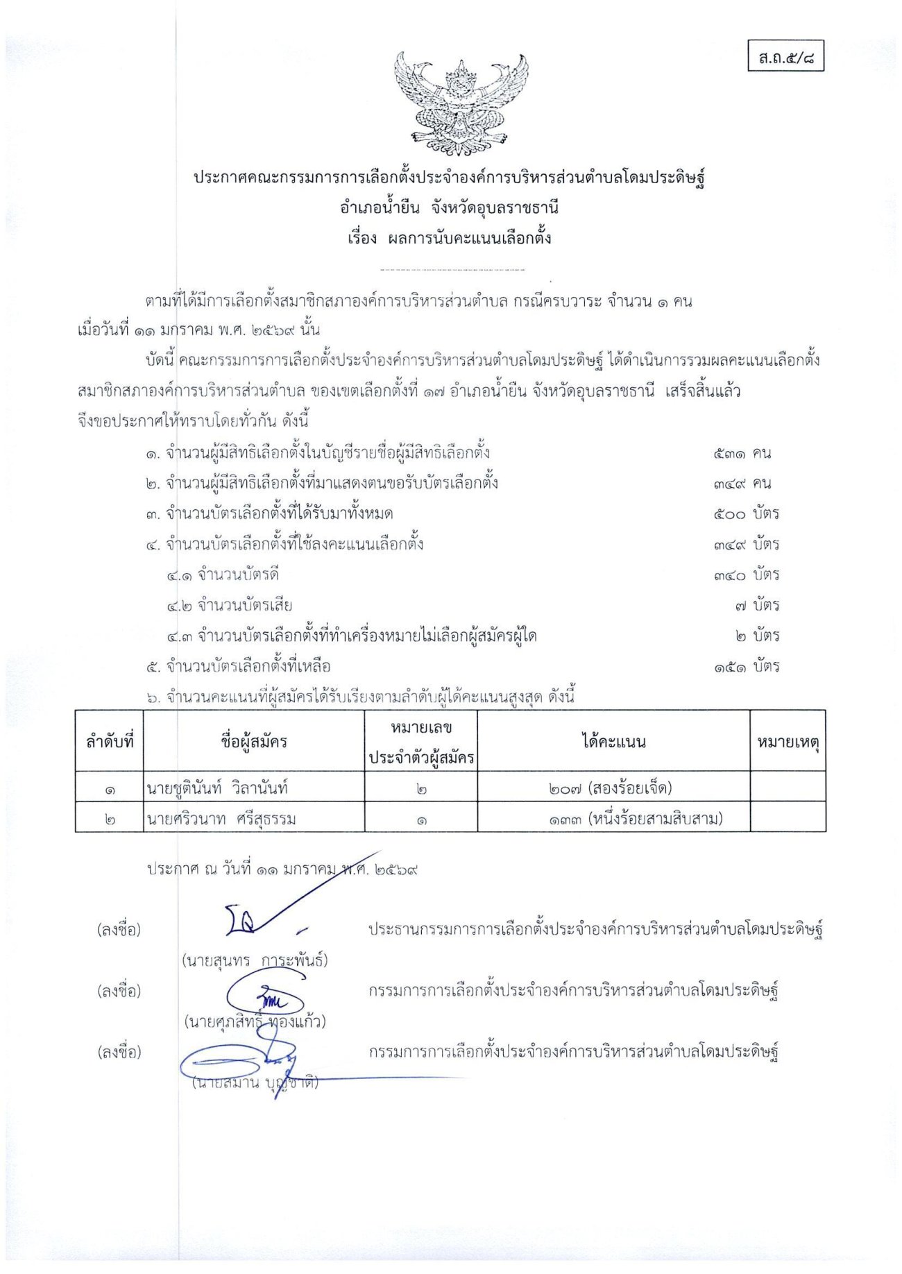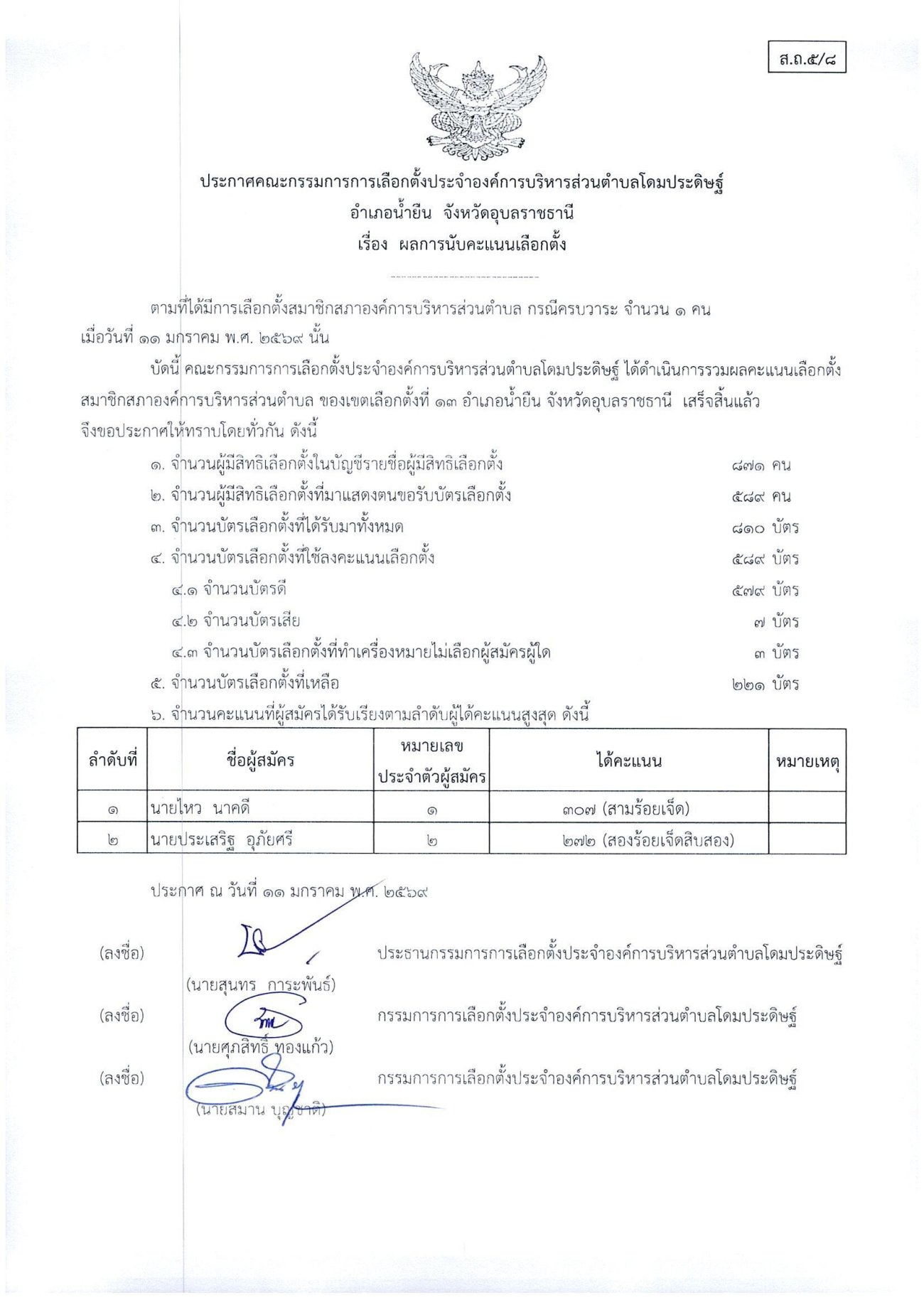 ประกาศเรื่องผลการนับคะแนนเลือกตั้งสมาชิกสภาองค์การบริหารส่วนตำบลโดมประดิษฐ์