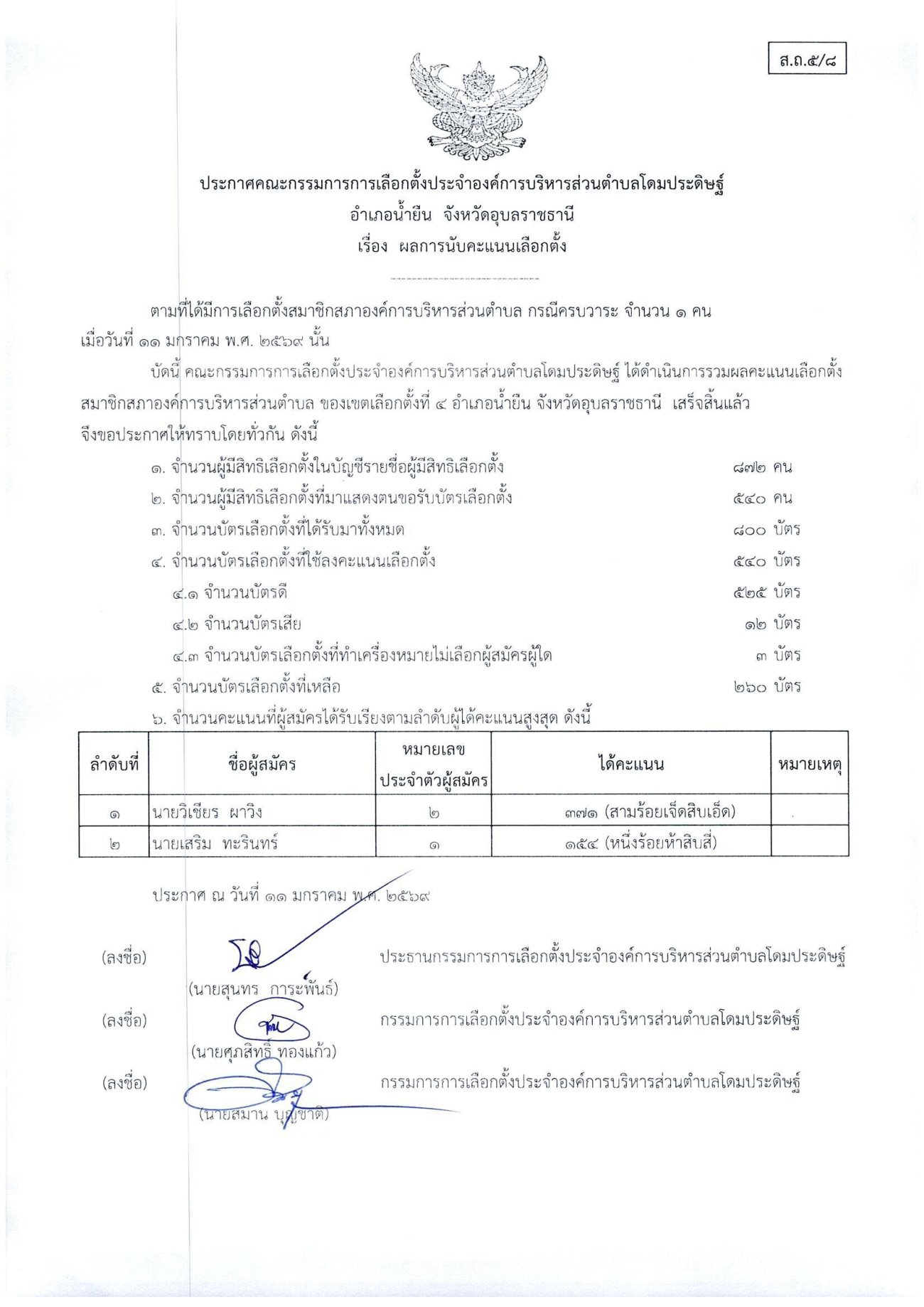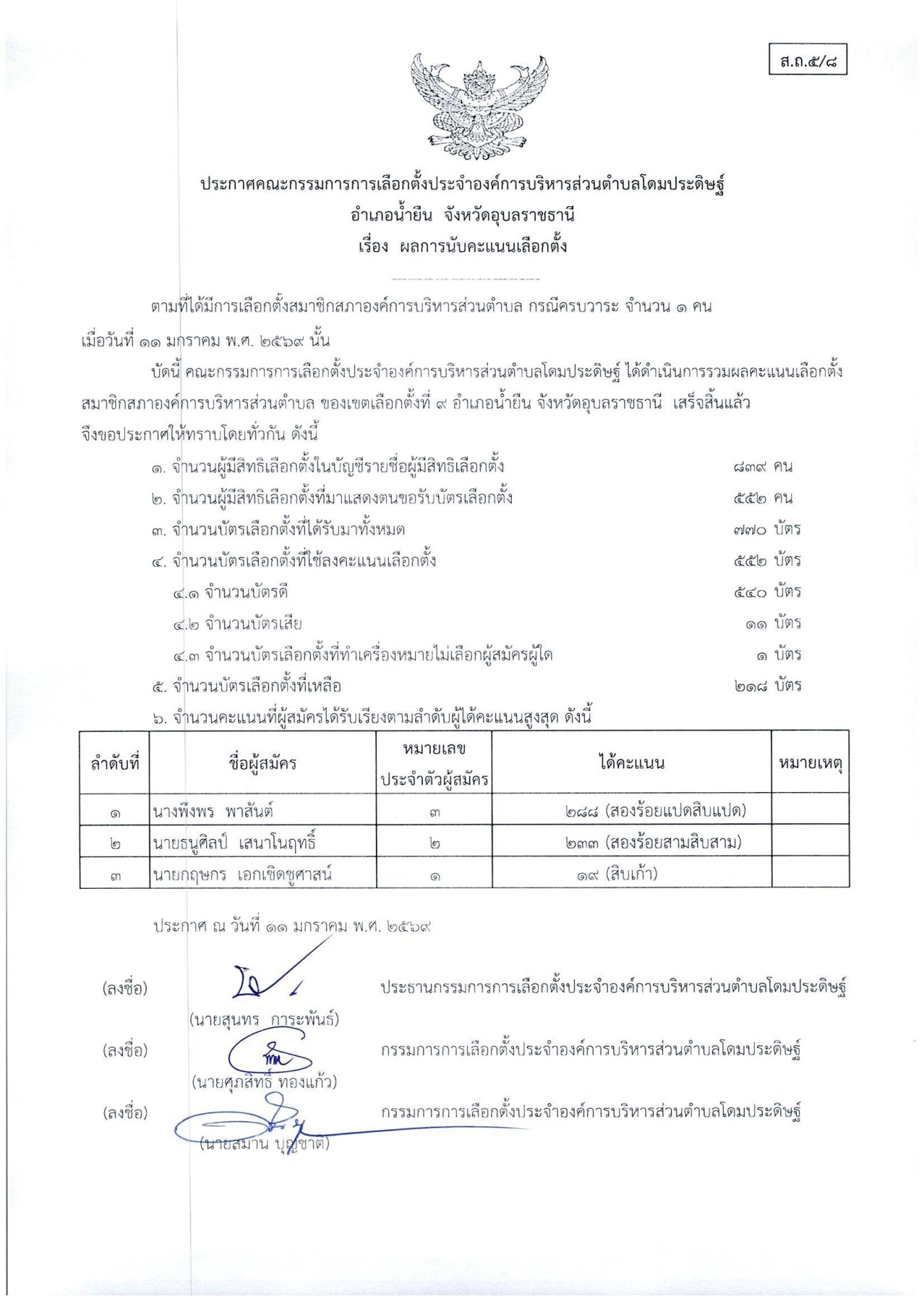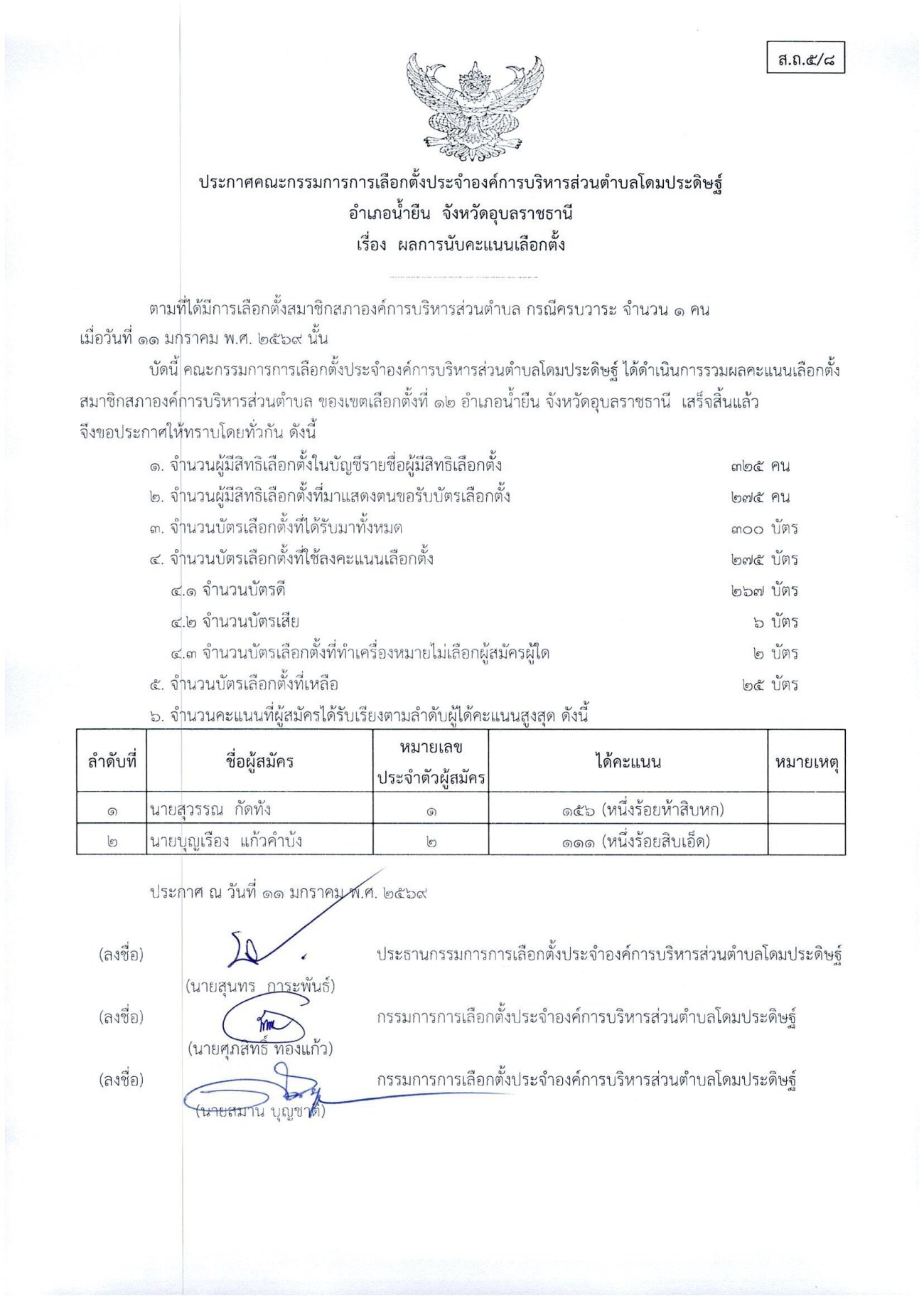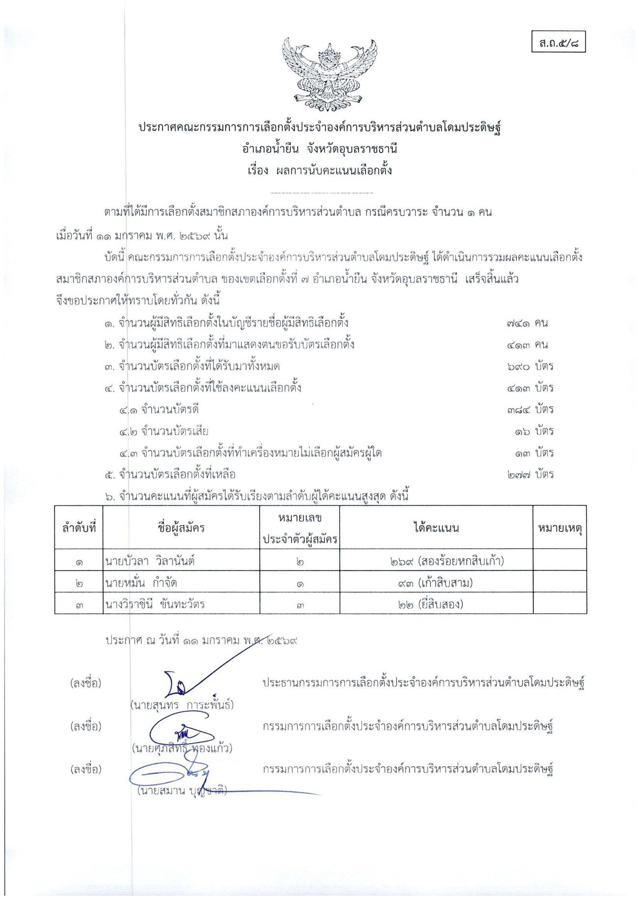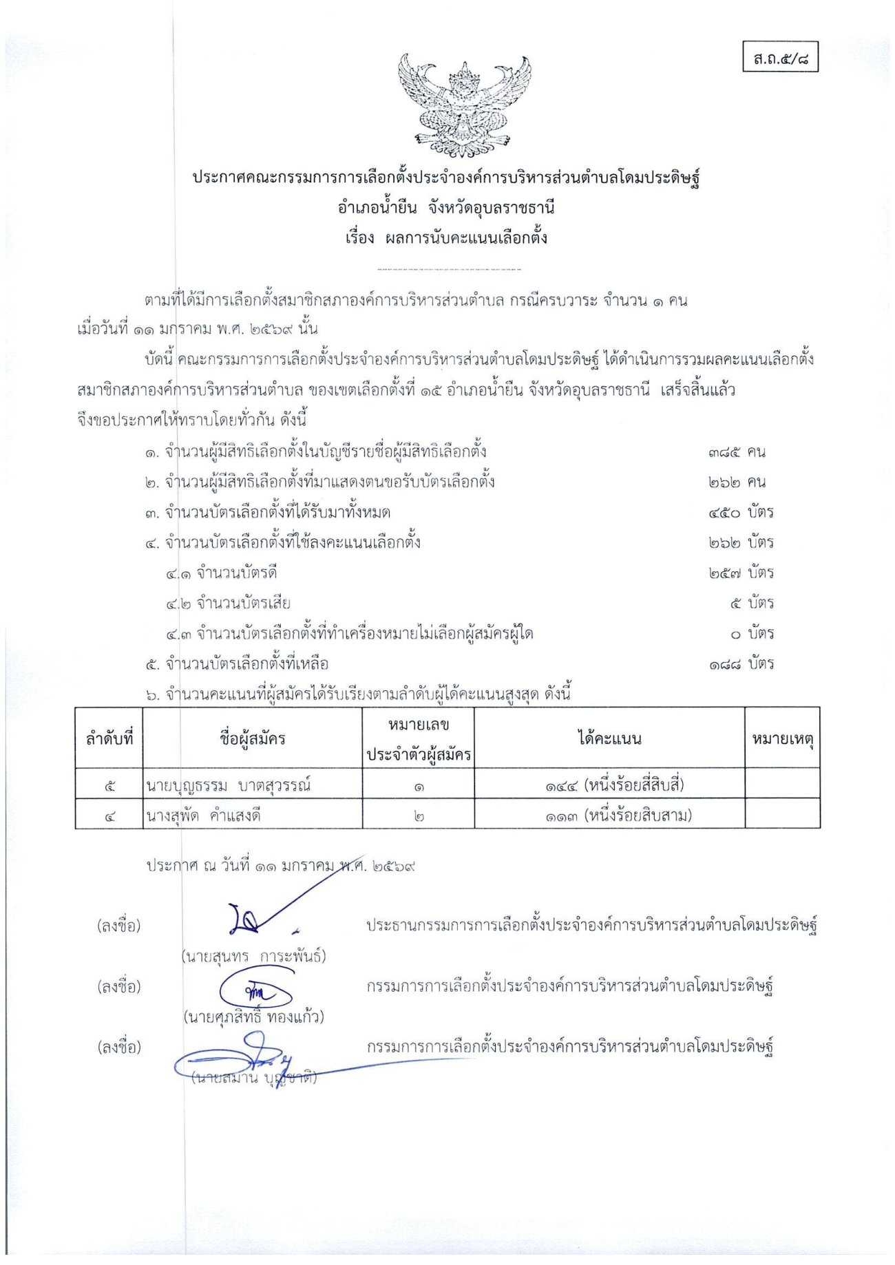 ประกาศเรื่องผลการนับคะแนนเลือกตั้งสมาชิกสภาองค์การบริหารส่วนตำบลโดมประดิษฐ์