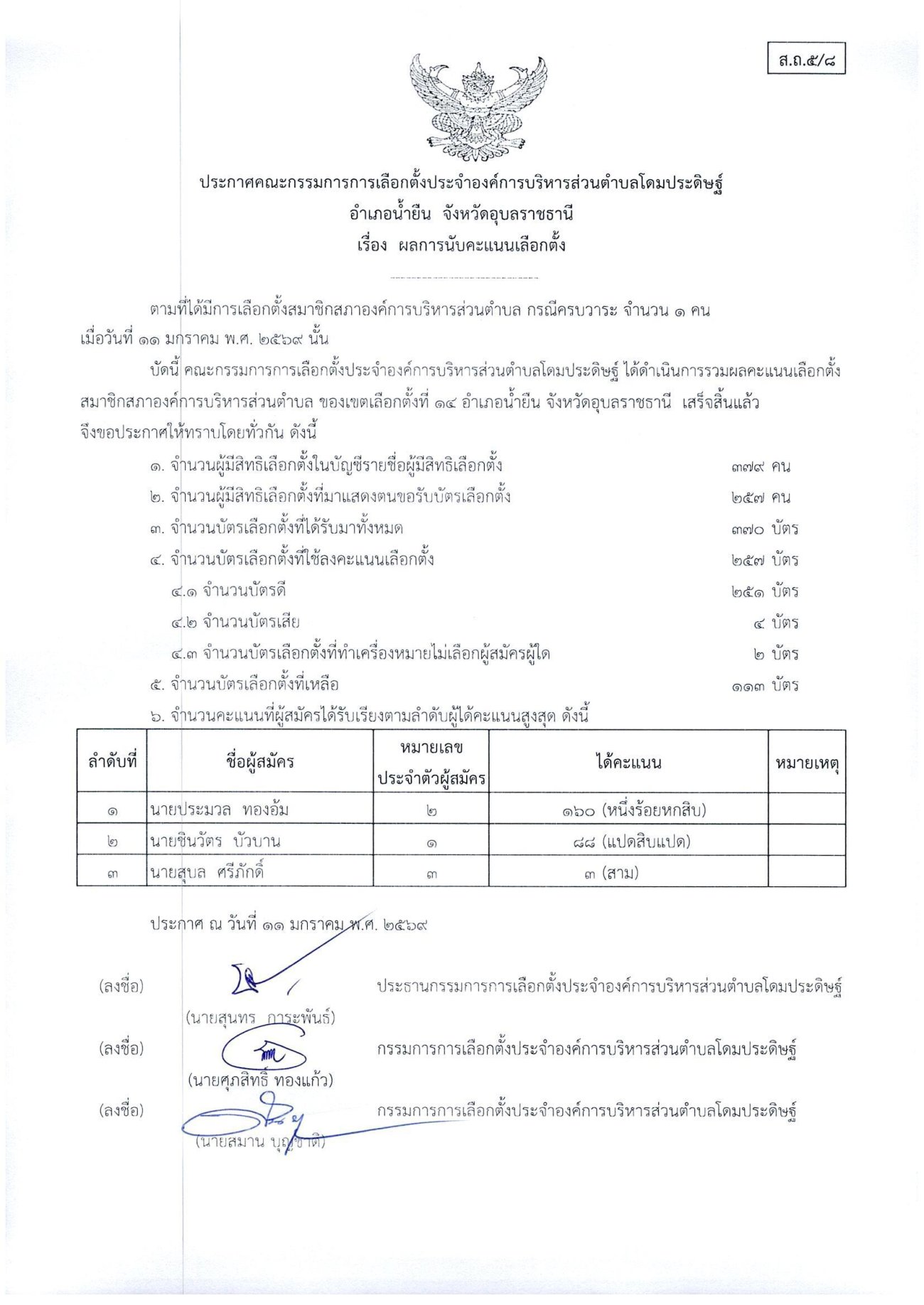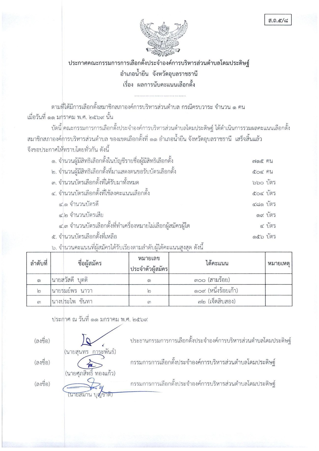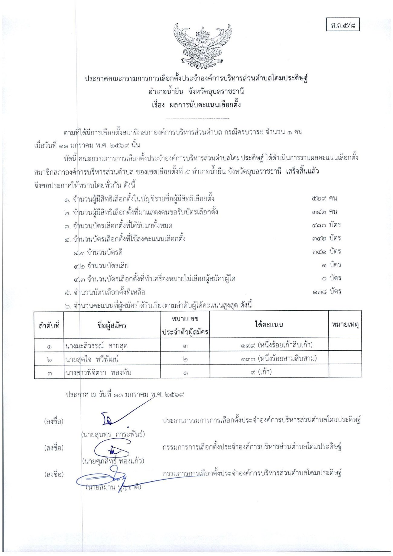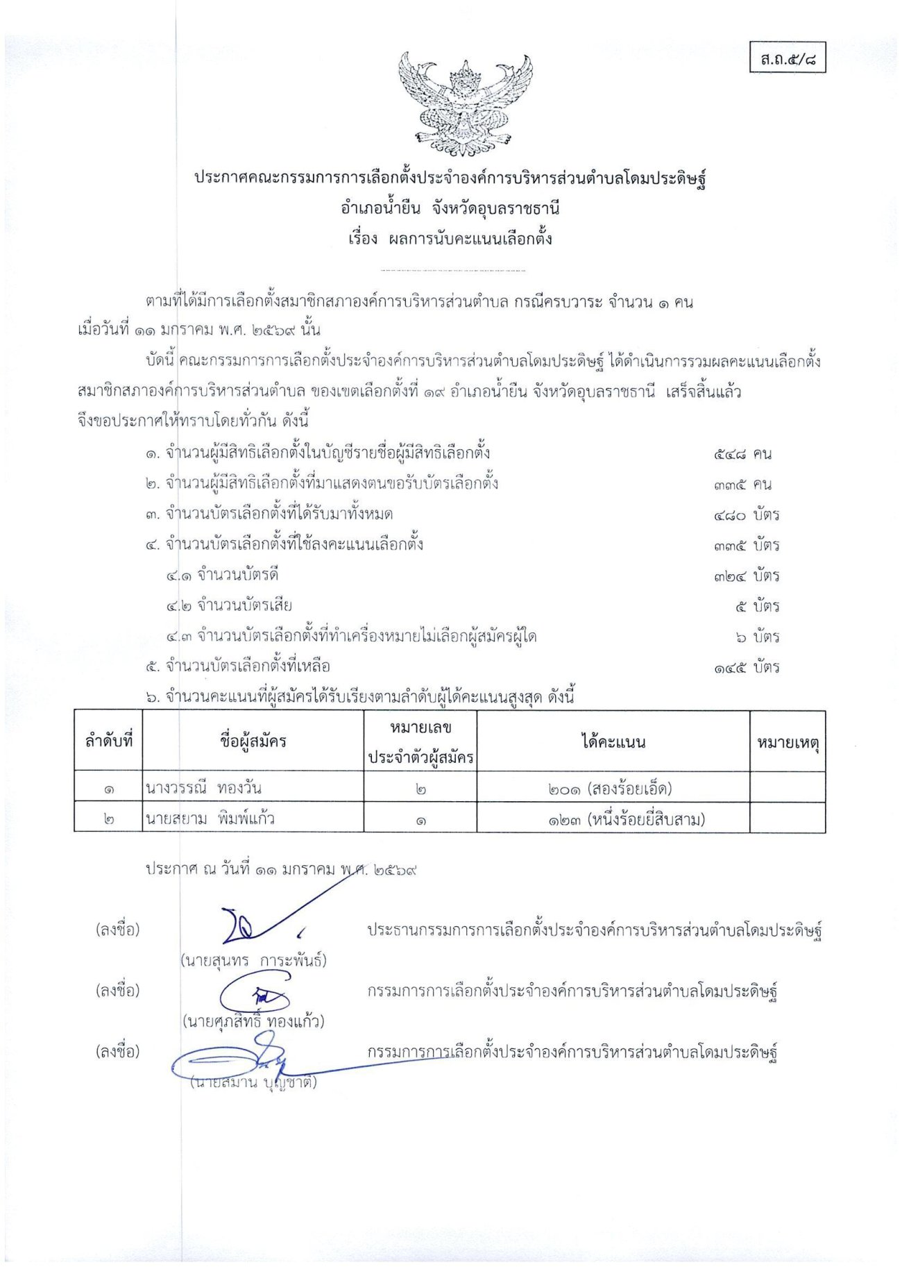ประกาศเรื่องผลการนับคะแนนเลือกตั้งสมาชิกสภาองค์การบริหารส่วนตำบลโดมประดิษฐ์